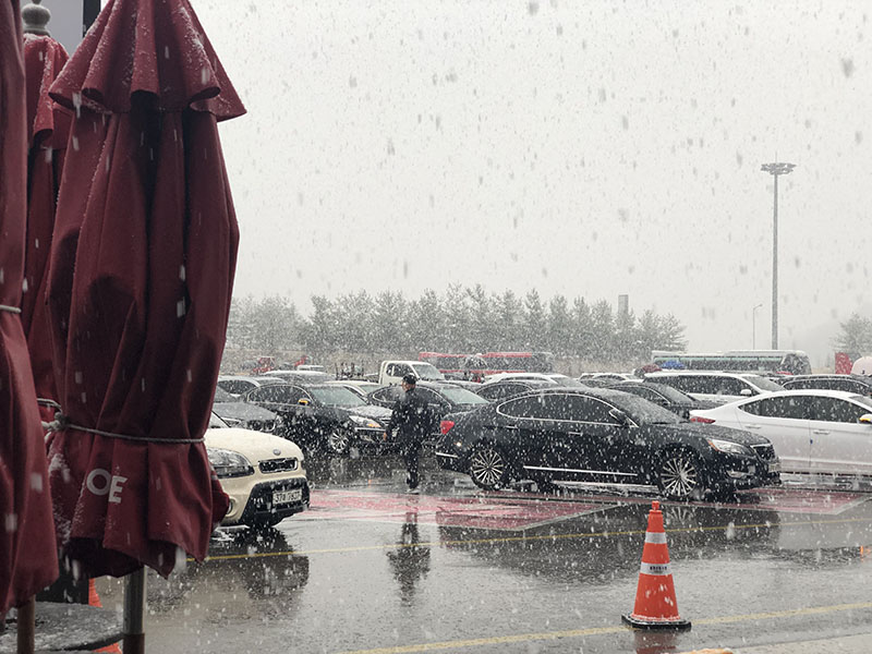 天気が崩れるのは分かっていたものの、途中すごい雪が降ってきたので、とりあえずサービスエリアでご飯を食べることに..。