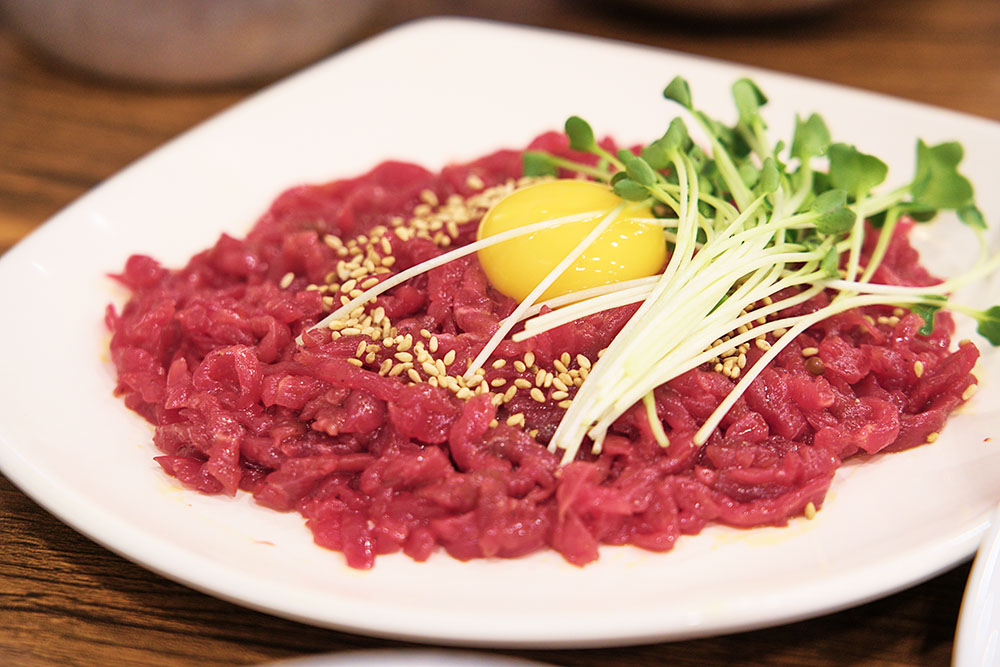 A traditional Korean dish made with raw beef. The beef is cut into thin strips and seasoned with sesame oil, soy sauce, garlic, sugar, and salt. It is typically served with julienned Korean pear and topped with a raw egg yolk.